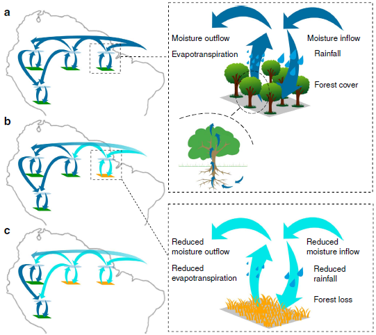 Na Figura 2a, o sistema vegetação-atmosfera está em equilíbrio. Na Figura 2b é ilustrado um contexto de perda inicial da floresta, que resulta, na ilustração, de uma diminuição no influxo de umidade oceânica, mas pode também ser ocasionada pelo desmatamento. Isso reduz a evapotranspiração local e, consequentemente, o transporte de umidade. Como resultado, o regime de chuvas é alterado em outro local, levando a uma maior perda de floresta e à redução do transporte de umidade para outras regiões (Figura 2c).